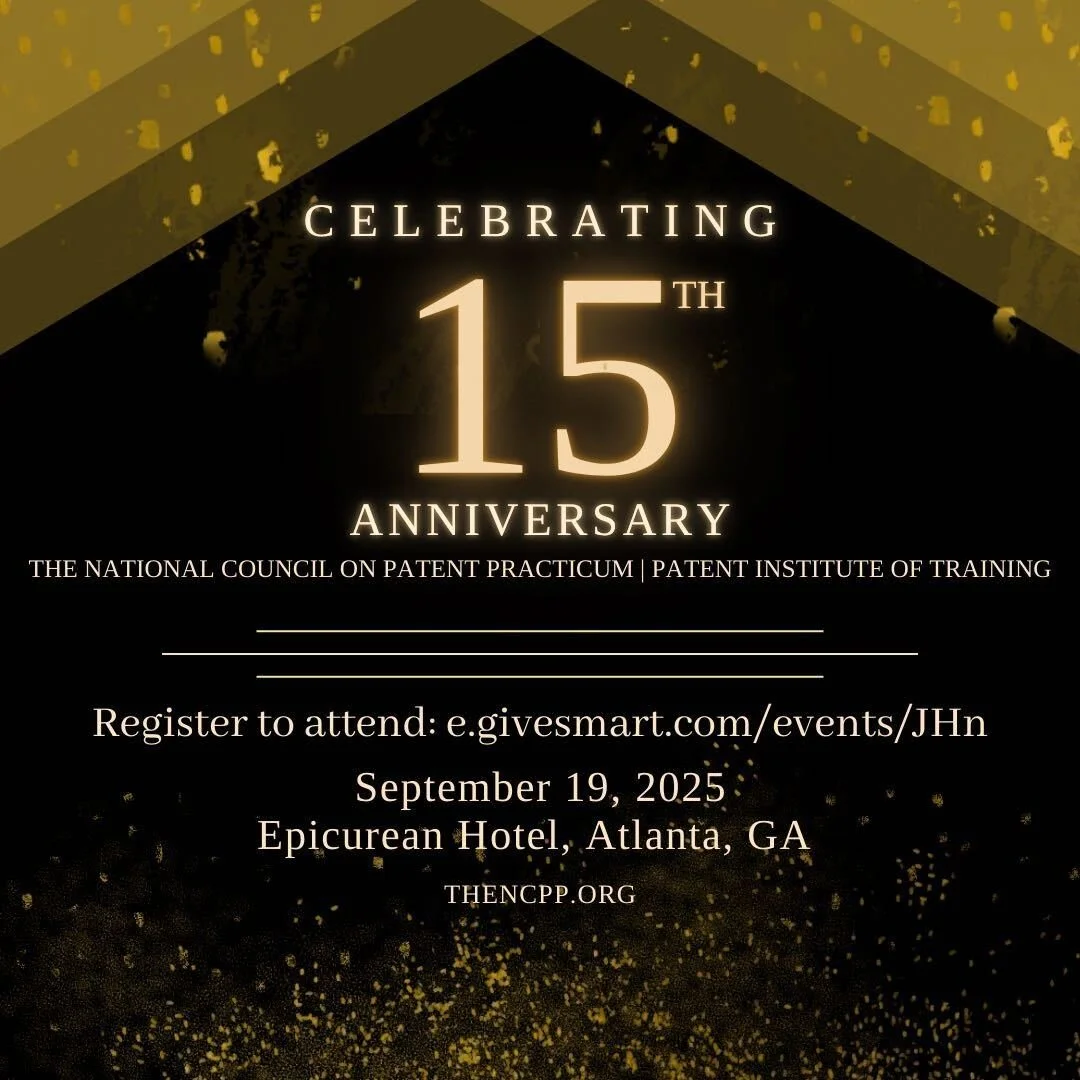 GIPA would like to invite you to join us in celebrating 15 years of commitment to patent practitioner development at the National Council on Patent Practicum's (NCPP) 15th Anniversary Celebration on September 19, 2025, from 6:00–9:00 PM at the Epicurean Autograph Collection Hotel in Atlanta, GA. This milestone event presents a unique opportunity to highlight leadership in the patent field while supporting the development of tomorrow’s top patent professionals. If you can attend, please register here.