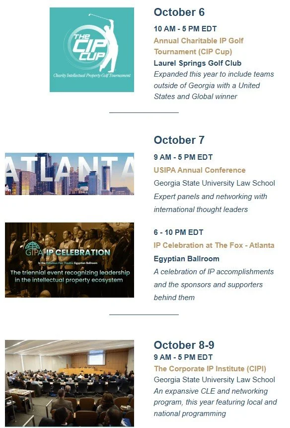 Building on our 20+ year legacy, the Georgia Intellectual Property Alliance, in partnership with the United States IP, Global IP, and Peace Harmony & Joy Alliances, is kicking off October IP Month with the following IP events in October: